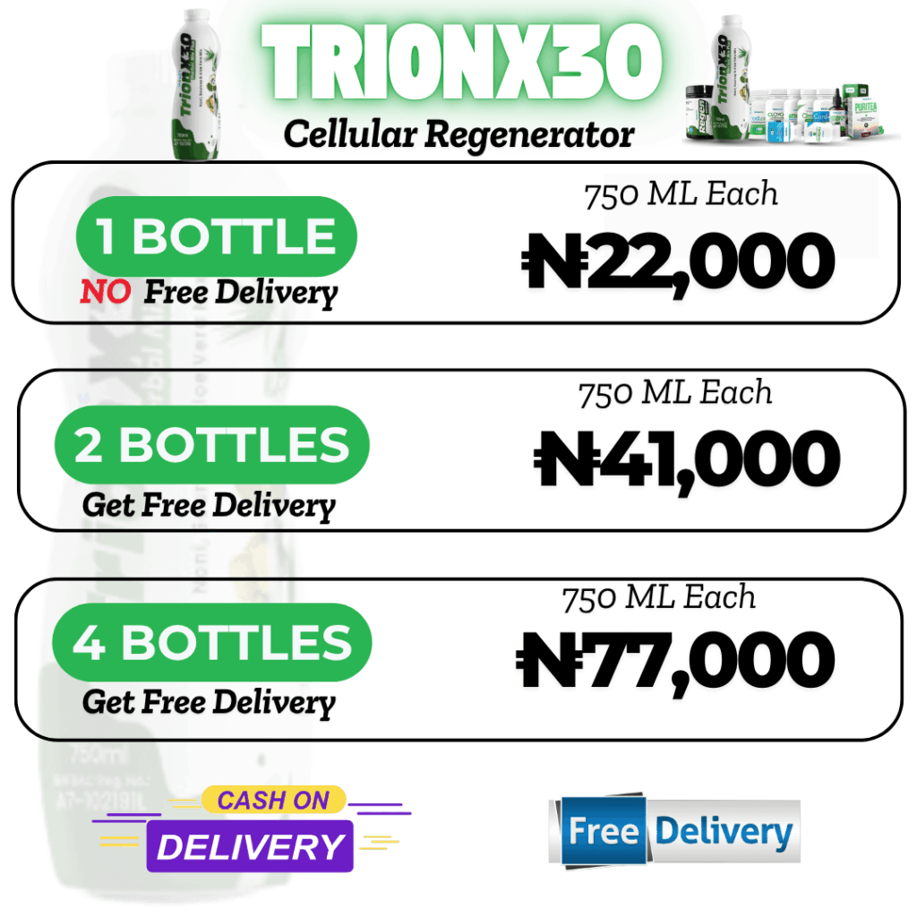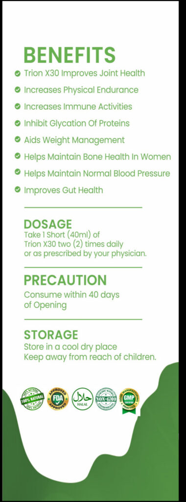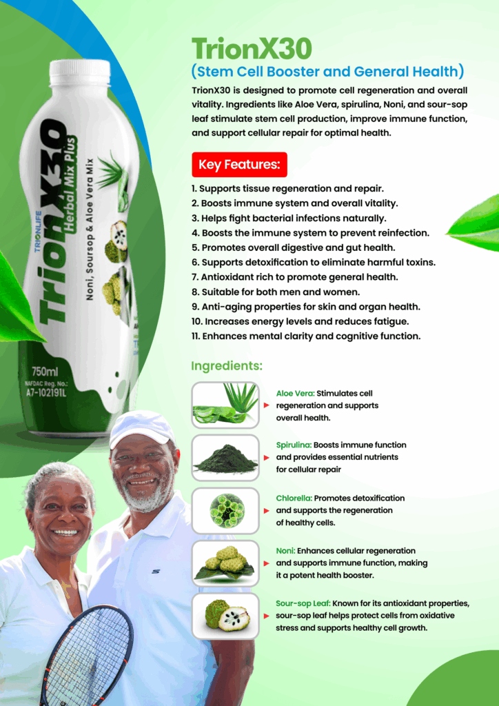 TRION X30 is a powerful stem cell booster and general health supplement designed to support cell regeneration, boost immunity, and enhance vitality. It contains natural ingredients like Aloe Vera, Spirulina, Noni, and Sour-Sop Leaf, which work together to promote tissue repair, detoxification, and overall well-being.